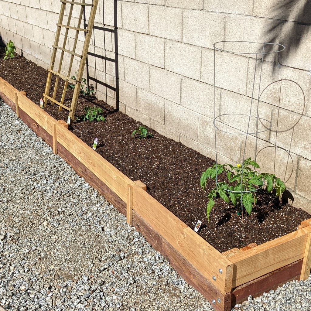 We were able to recycle almost all of the wood from the old planter, it is the darker more aged wood on the bottom. So far, so good- the plants are looking very healthy and we are looking forward to a bumper crop of vegetables this summer!