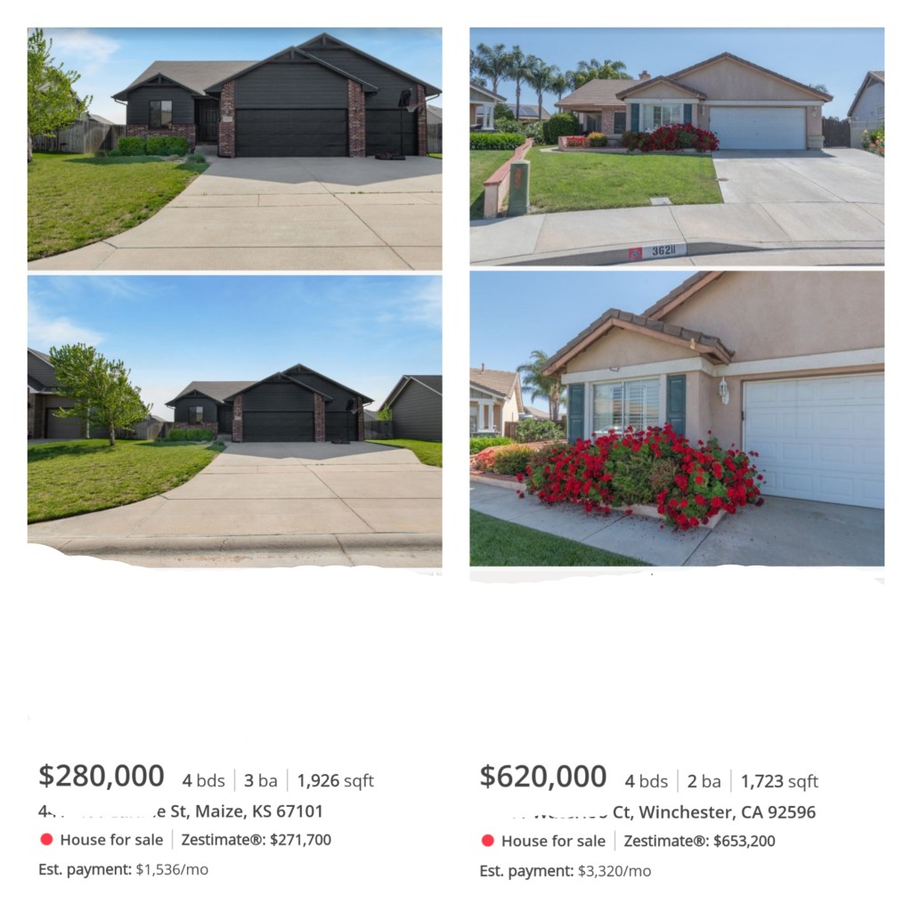 I’m using the example of the Wichita Kansas metro area and the Temecula Valley area of Southern California. Above are screenshots of two properties for sale roughly around the same size, both having four bedrooms. Typical generic single story tract homes.