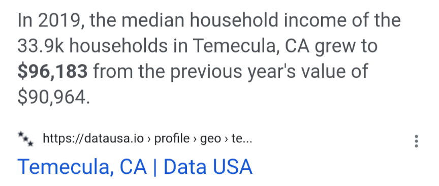 As you can see in the picture below, given income rising at the same pace between the last data provided in 2019 and 2022 – it’s reasonable to assume that the average income in Temecula is likely now around $115,000 a year – slightly less than what you would need to buy this home.