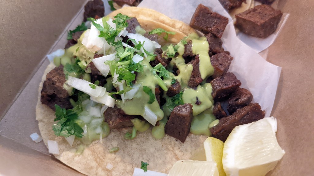 One of my all-time favorite places, Amo Naktl Asada (https://instagram.com/amonakatlasada) is located inside this food hall and cooks up the most amazing vegan Mexican food. Pictured below are the beefless asada street tacos.
