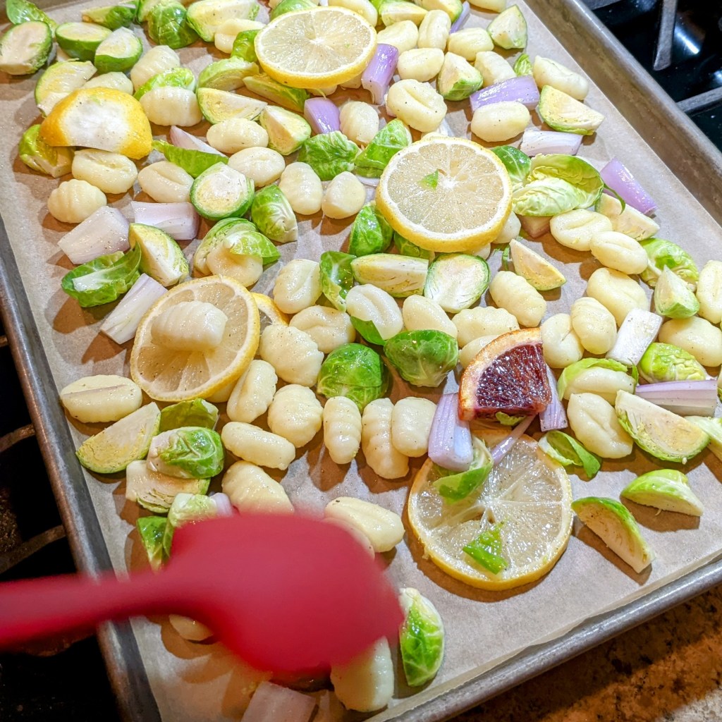 For the good, bad or tasteless – the plan is to make these recipes as they are presented on the website, magazine or cookbook we find them in. This one is ‘roasted gnocchi and brussel sprouts with meyer lemon vinaigrette’; it’s from eatingwell.com